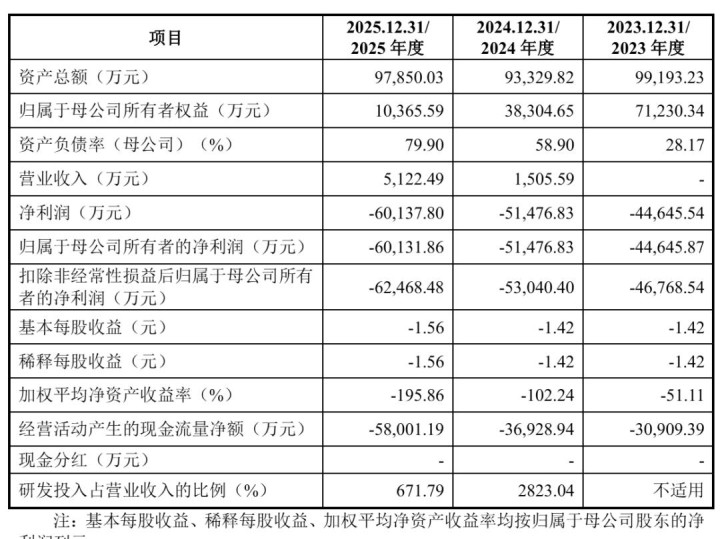 招股书显示,泰诺麦博2023年、2024年、2025年营收分别为0元、1506万元、5122万;净亏损分别为4.46亿元、5.15亿元、6亿元;扣非后净利分别为4.68亿元、5.3亿元、6.25亿元。