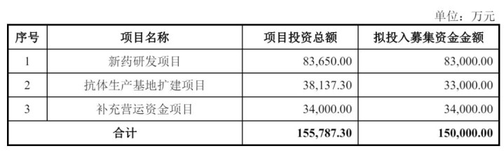 泰诺麦博计划募资15亿元,其中,8.3亿元用于新药研发项目,3.3亿元用于抗体生产基地扩建项目,3.4亿元用于补充营运资金项目。