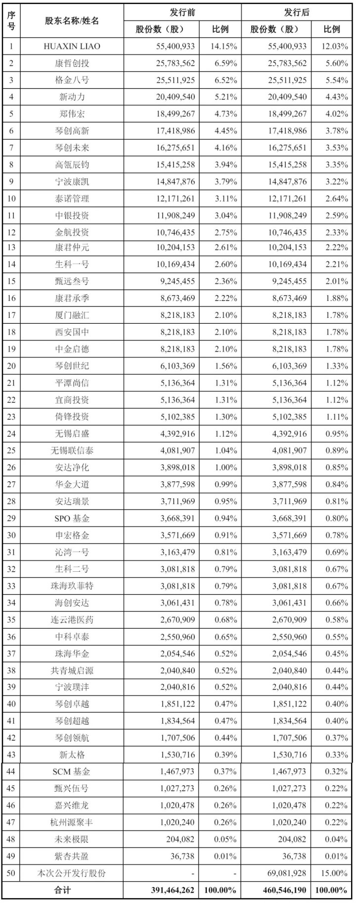 IPO后,HUAXIN LIAO直接持股为12.03%,康哲创投持股为5.6%,格金八号持股为5.54%,新动力持股为4.43%,郑伟宏持股为4.02%,琴创高新持股为3.78%,琴创未来持股为3.53%,高瓴辰钧持股为3.35%,宁波康凯持股为3.22%,泰诺管理持股为2.64%;